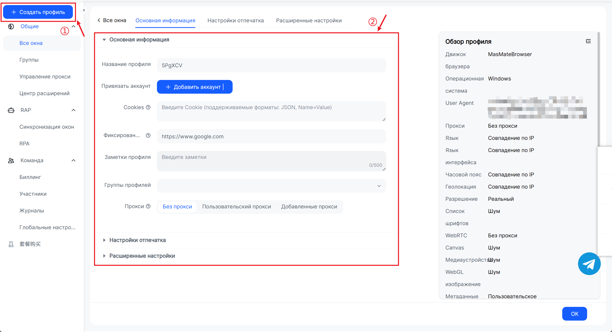 - В MasLogin в разделе «Все окна» нажмите «Создать окружение», назовите, например,