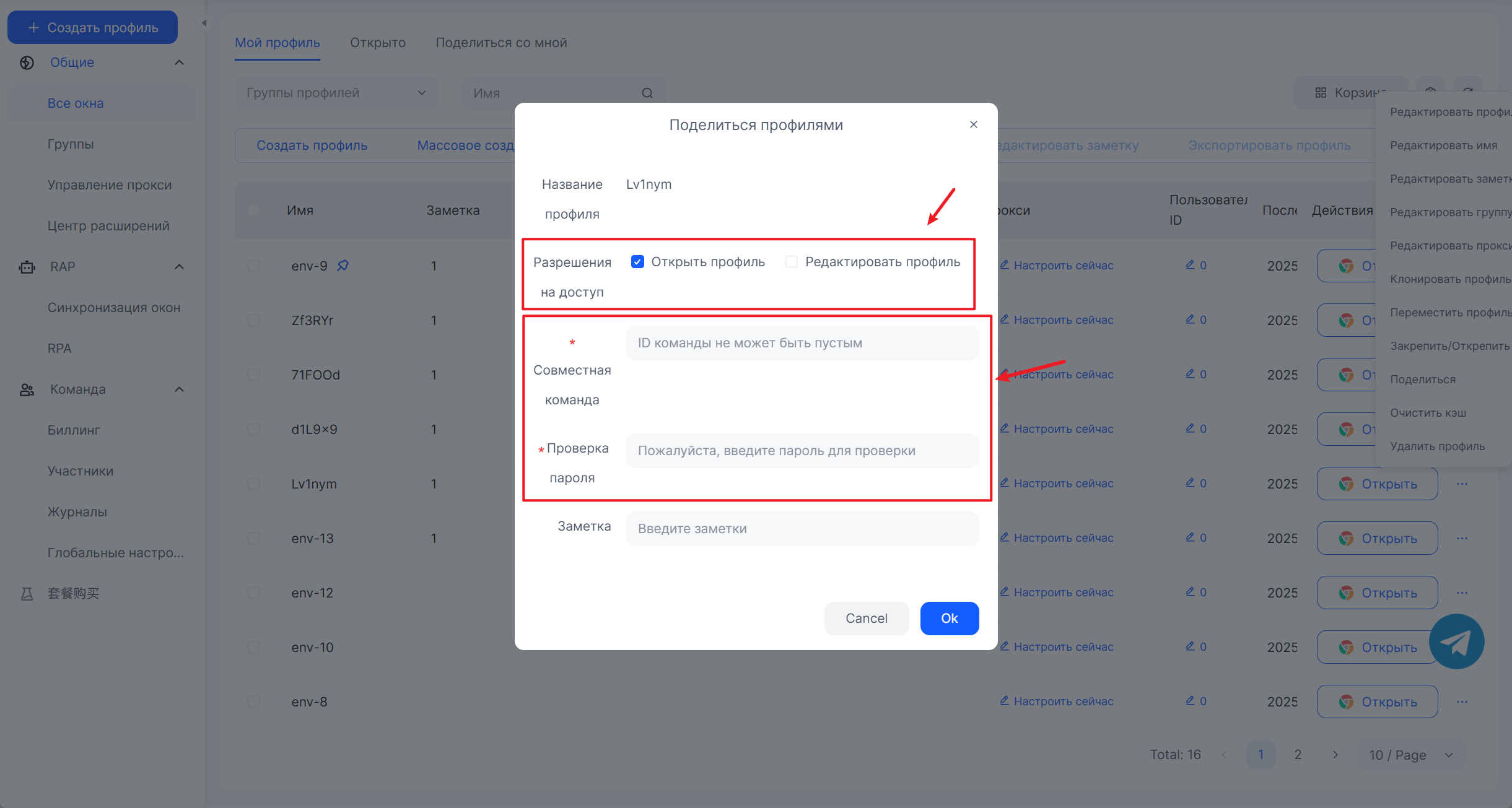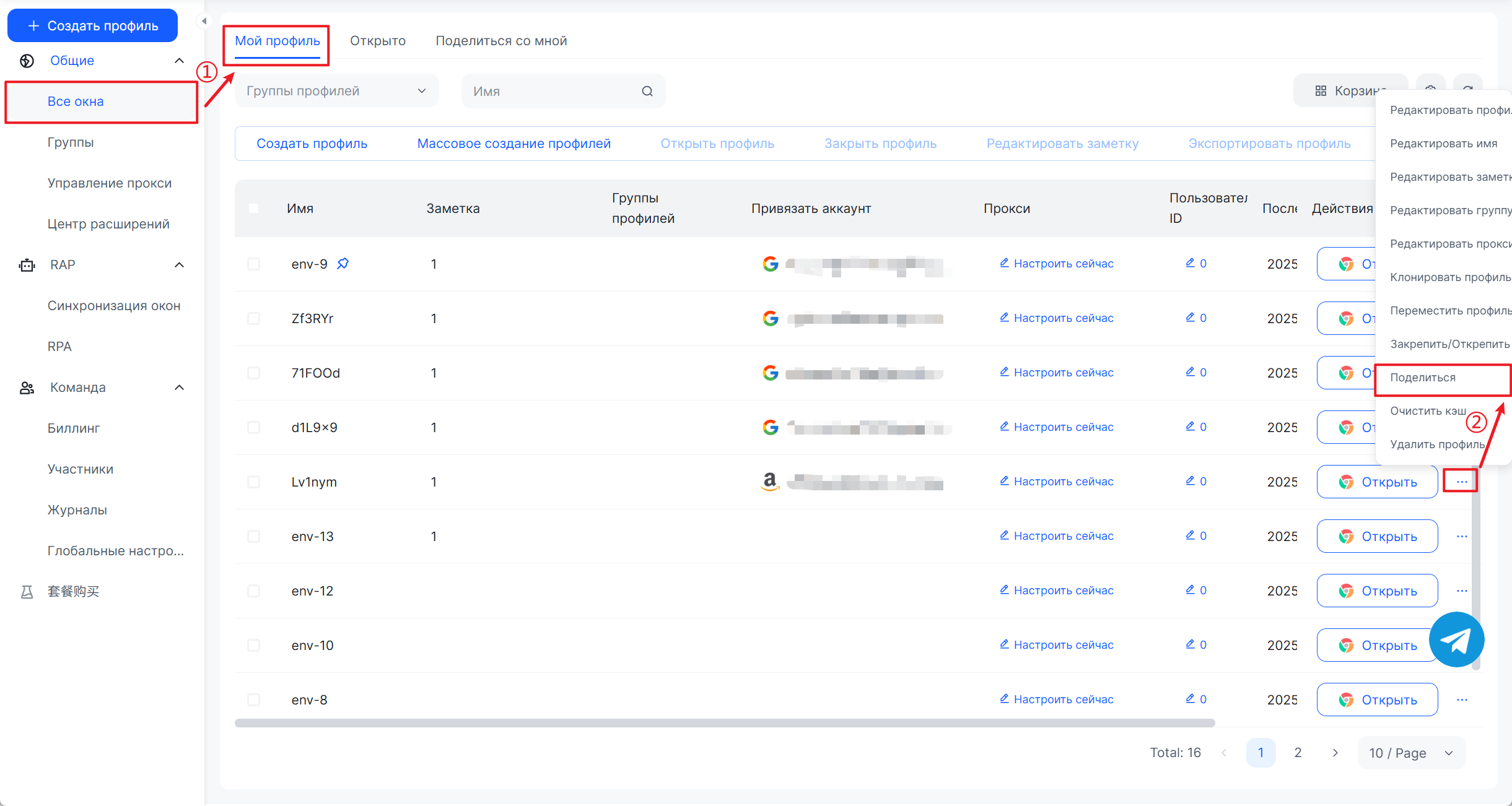- Вернитесь в «Все окна» и выберите у нужного окружения … → «Поделиться».
