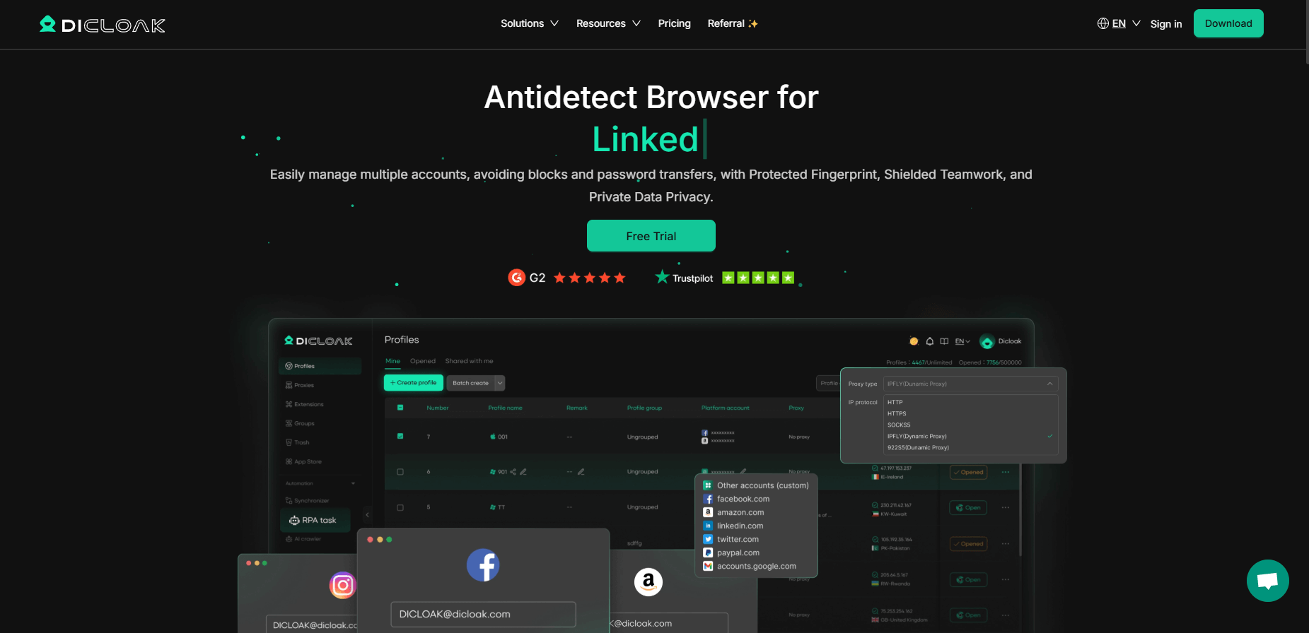 An emerging solution known for affordability and ease of use. It offers quick profile creation, automation scripts, and a user-friendly interface. Best for beginners in e-commerce or social media.