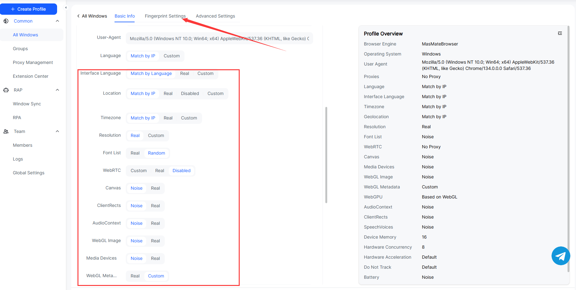 You’ll find that each MasLogin environment generates a completely unique fingerprint, with detection results showing “non-unique” or “randomized fingerprint.”