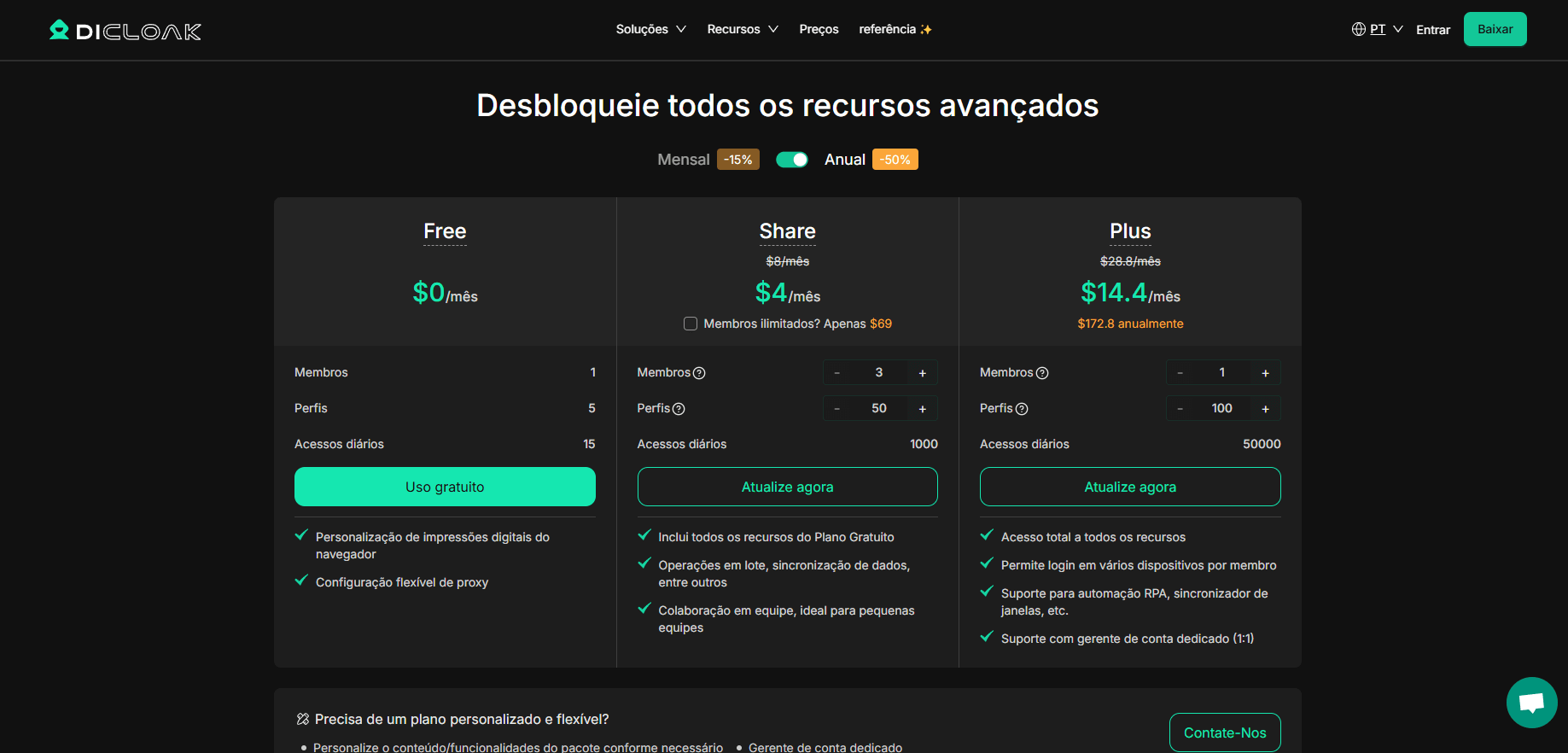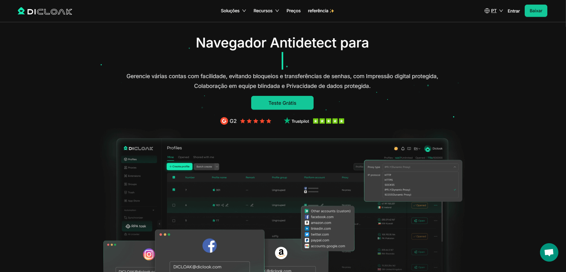 O DICloak é uma solução completa de navegador antidetect, oferecendo isolamento de contas, proxies, automação, colaboração em equipe e auditoria de segurança.