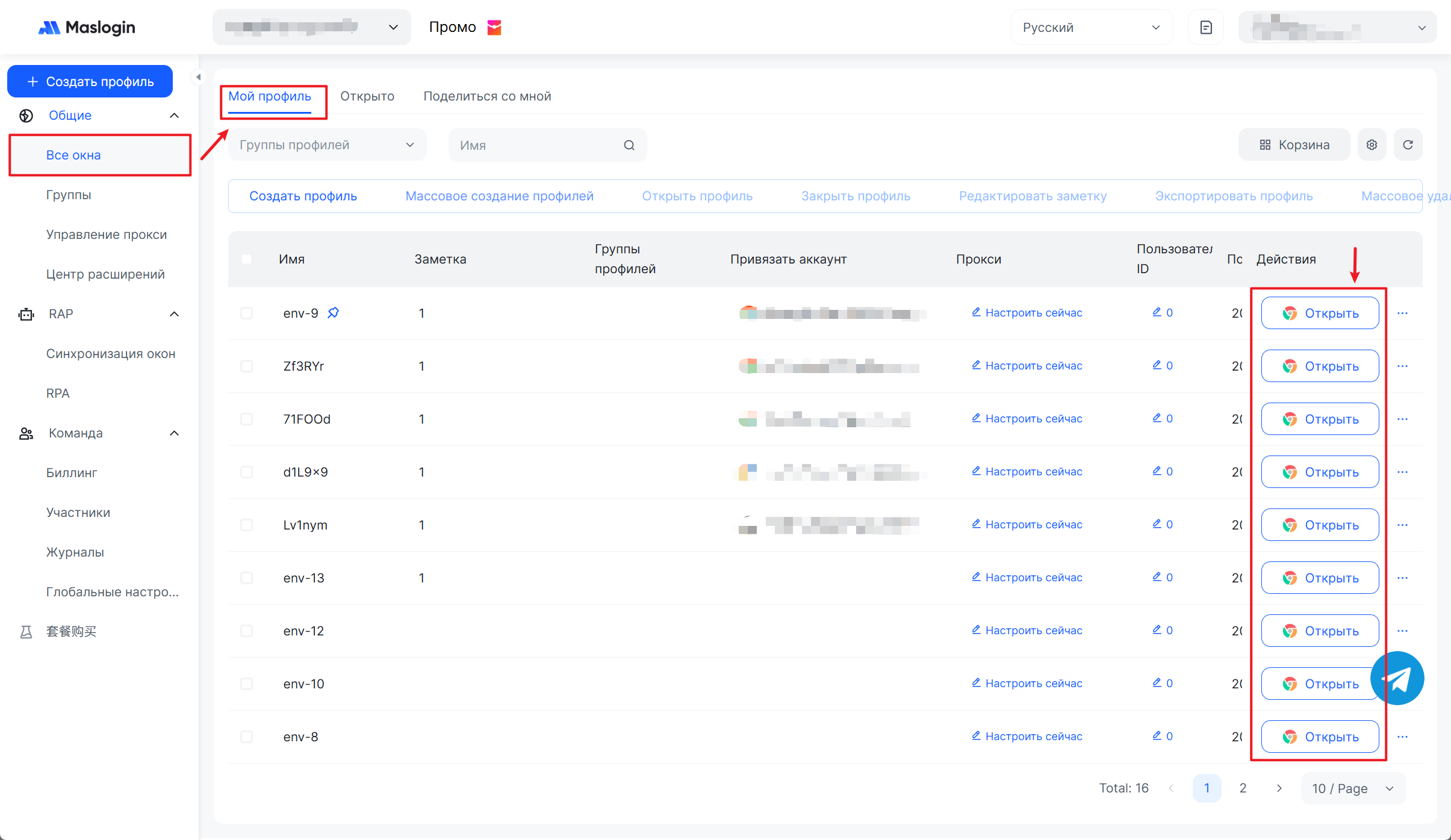 3. После добавления откройте Все окна › Мои , найдите среду с привязанным аккаунтом и нажмите .