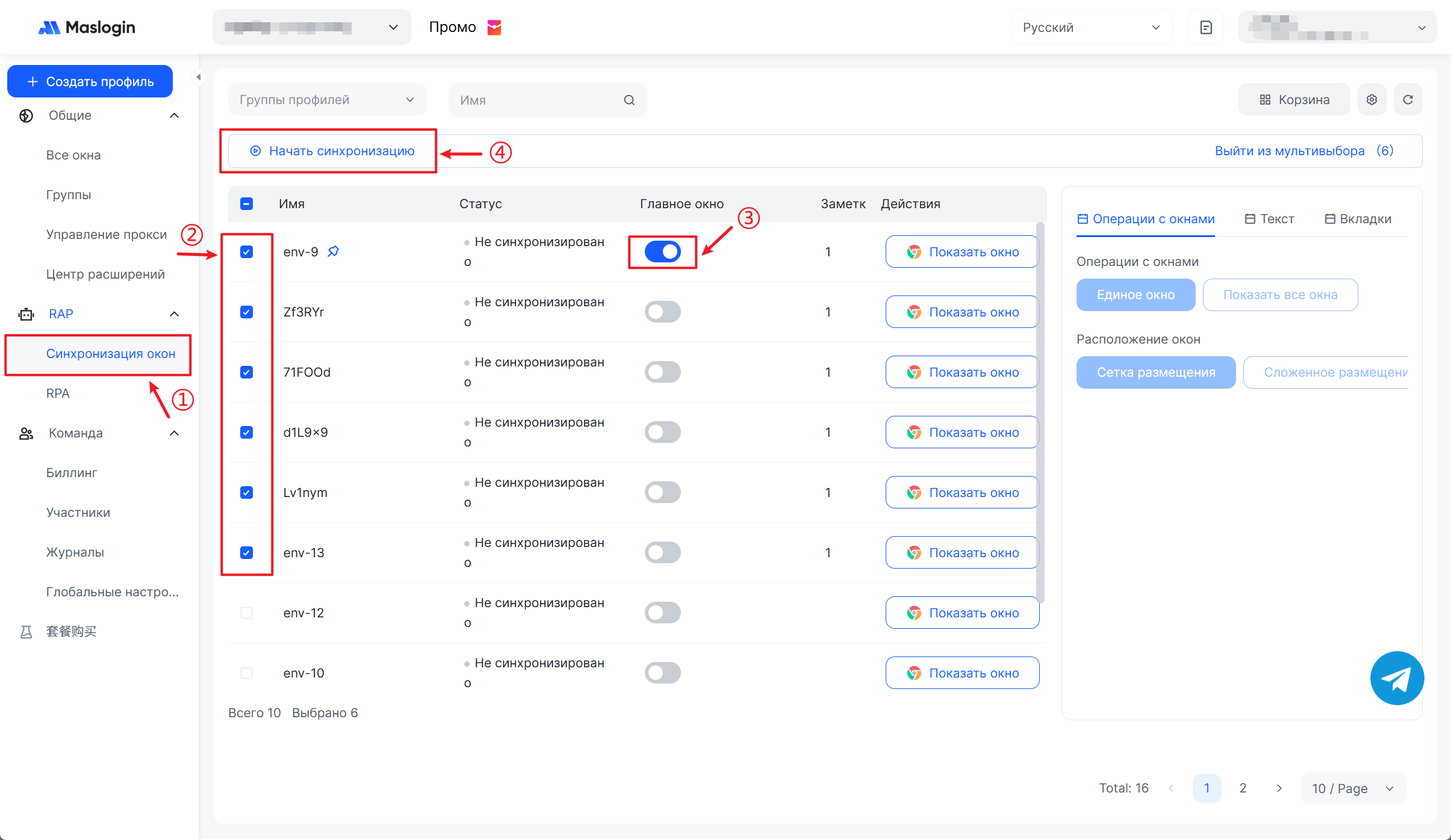 4. Чтобы параллельно вести несколько аккаунтов, откройте Синхронизацию окон, отметьте нужные среды, выберите одну как Главное окно и нажмите Начать синхронизацию — так вы безопасно управляете несколькими аккаунтами LinkedIn одновременно.