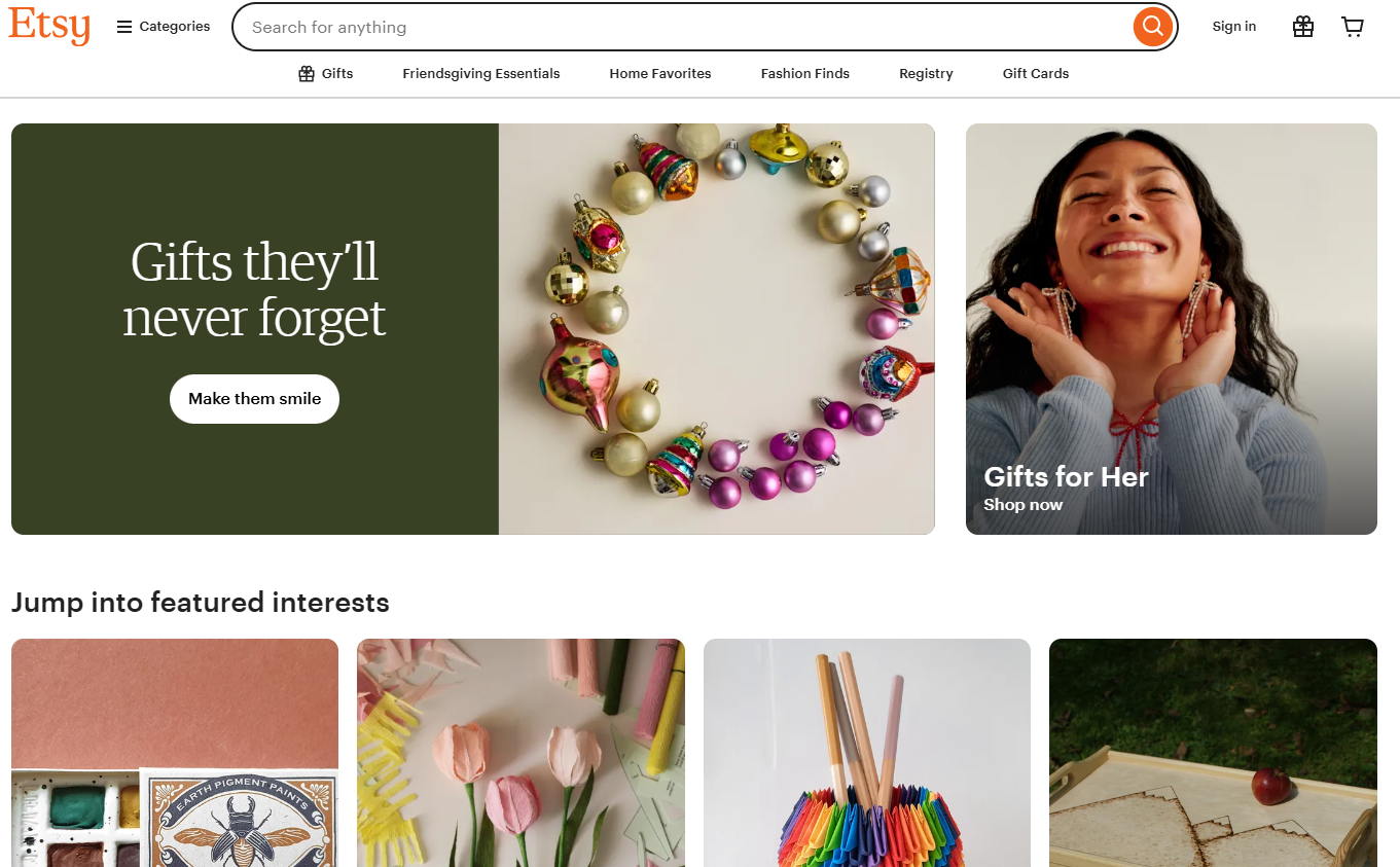 Etsy เป็นแพลตฟอร์มอีคอมเมิร์ซระดับโลกที่เปิดโอกาสให้ศิลปิน นักออกแบบ และผู้ประกอบการขายสินค้าแฮนด์เมด ดิจิทัล หรือสินค้าพิมพ์ตามสั่ง (Print on Demand) ได้อย่างง่ายดาย ไม่จำเป็นต้องมีทุนจำนวนมากหรือคลังสินค้าเอง
