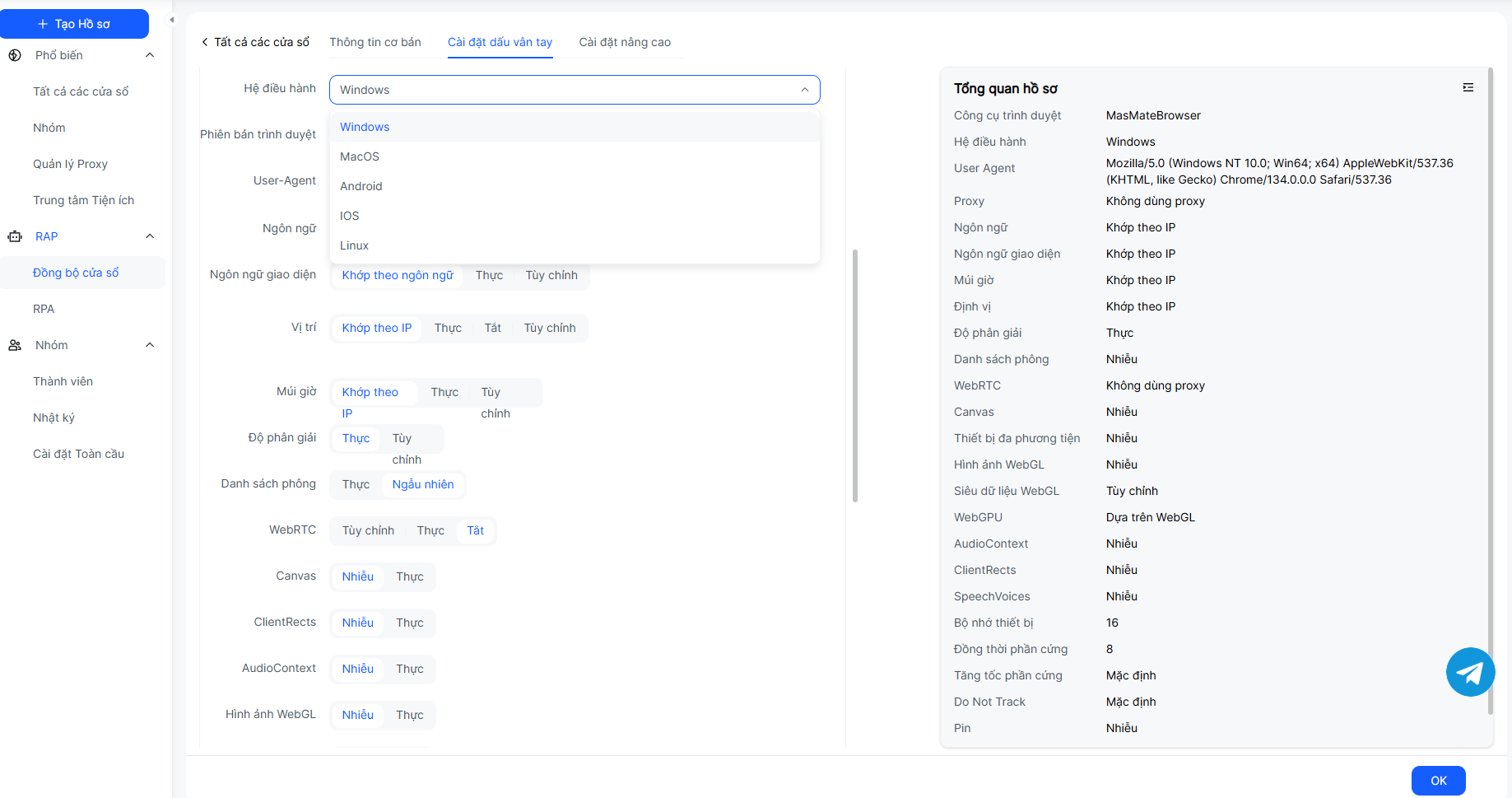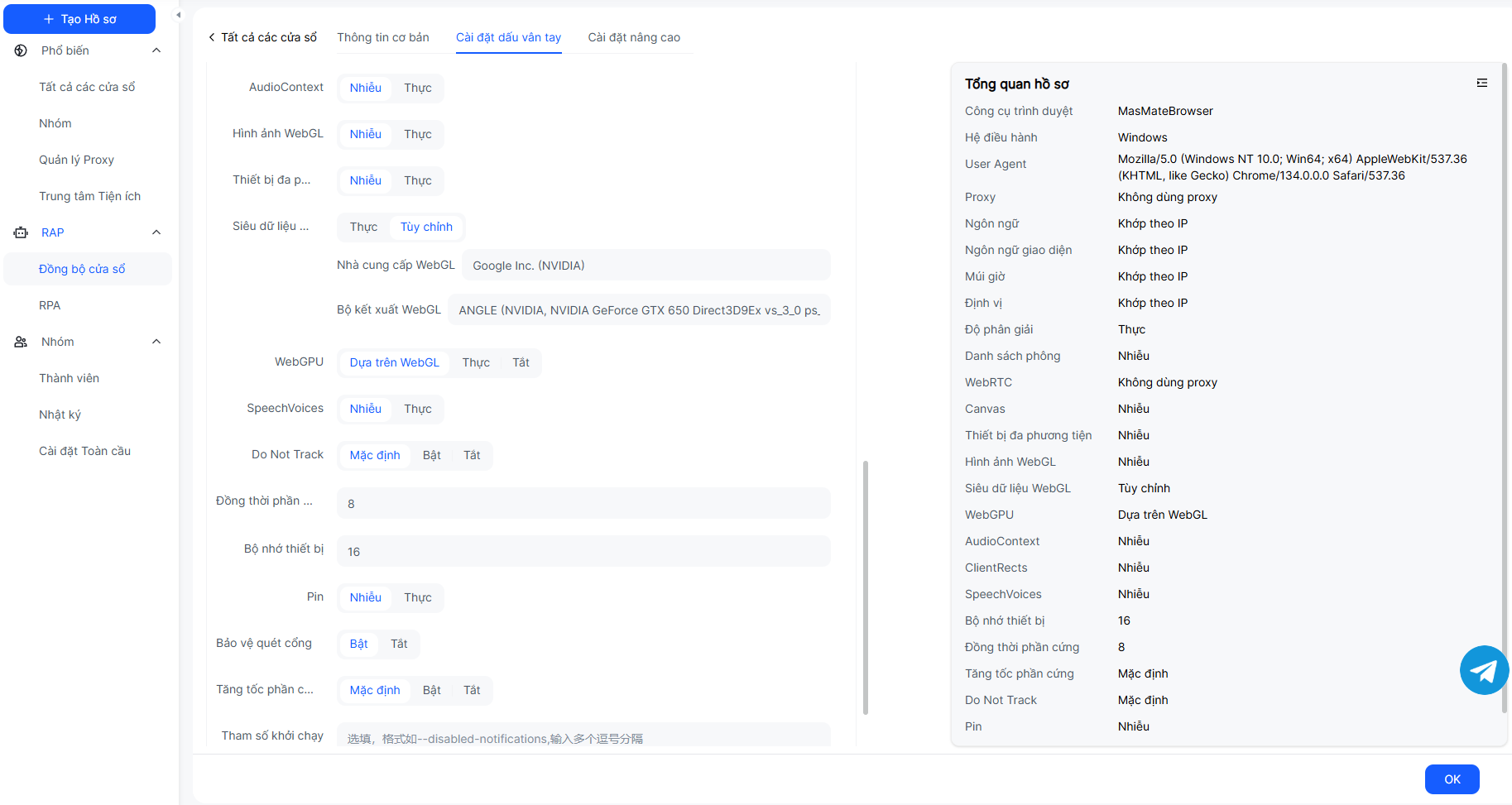 MasLogin cho phép người dùng tùy chỉnh sâu từng thông số dấu vân tay, như Canvas, WebGL, Fonts, TimeZone và User-Agent.