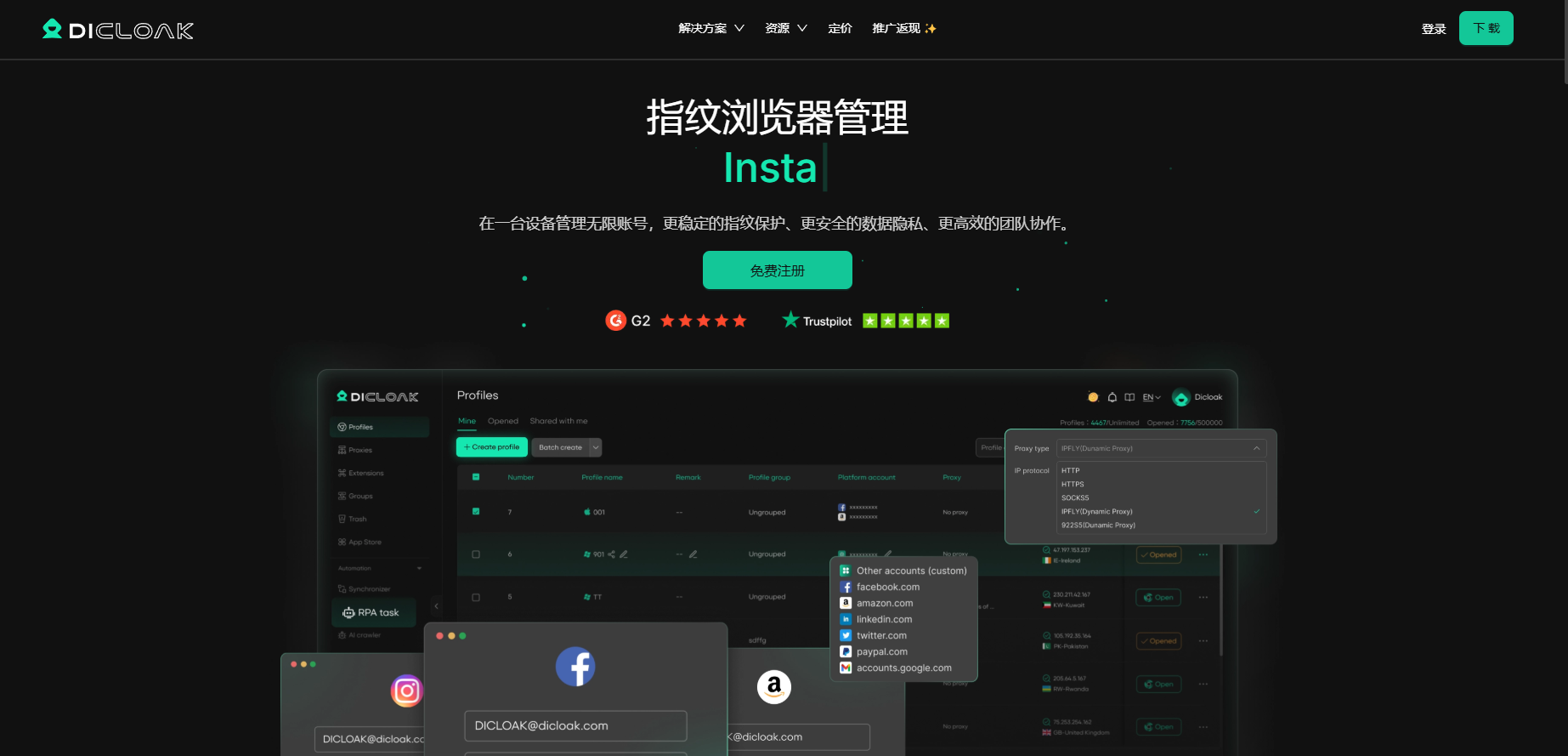 作为一款专业的 反检测浏览器,DICloak 提供了 代理兼容、多账号隔离、自动化操作、团队协作和安全日志 等全套功能,帮助用户在电商、广告、社媒和数据采集等场景下安全运营多个账号。