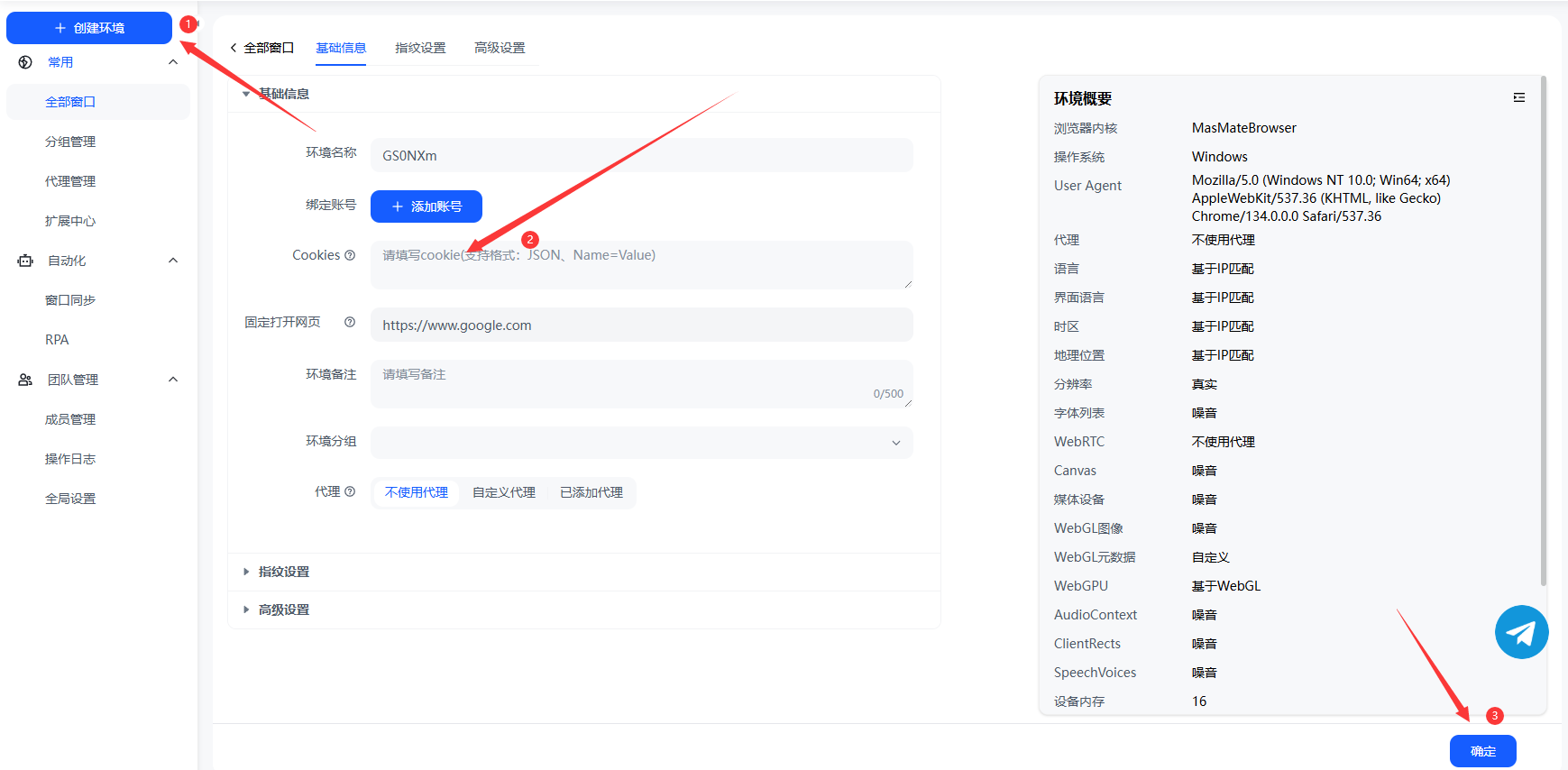 在 MasLogin 控制面板中点击 “创建新环境”,设置浏览器名称、操作系统和代理 IP。