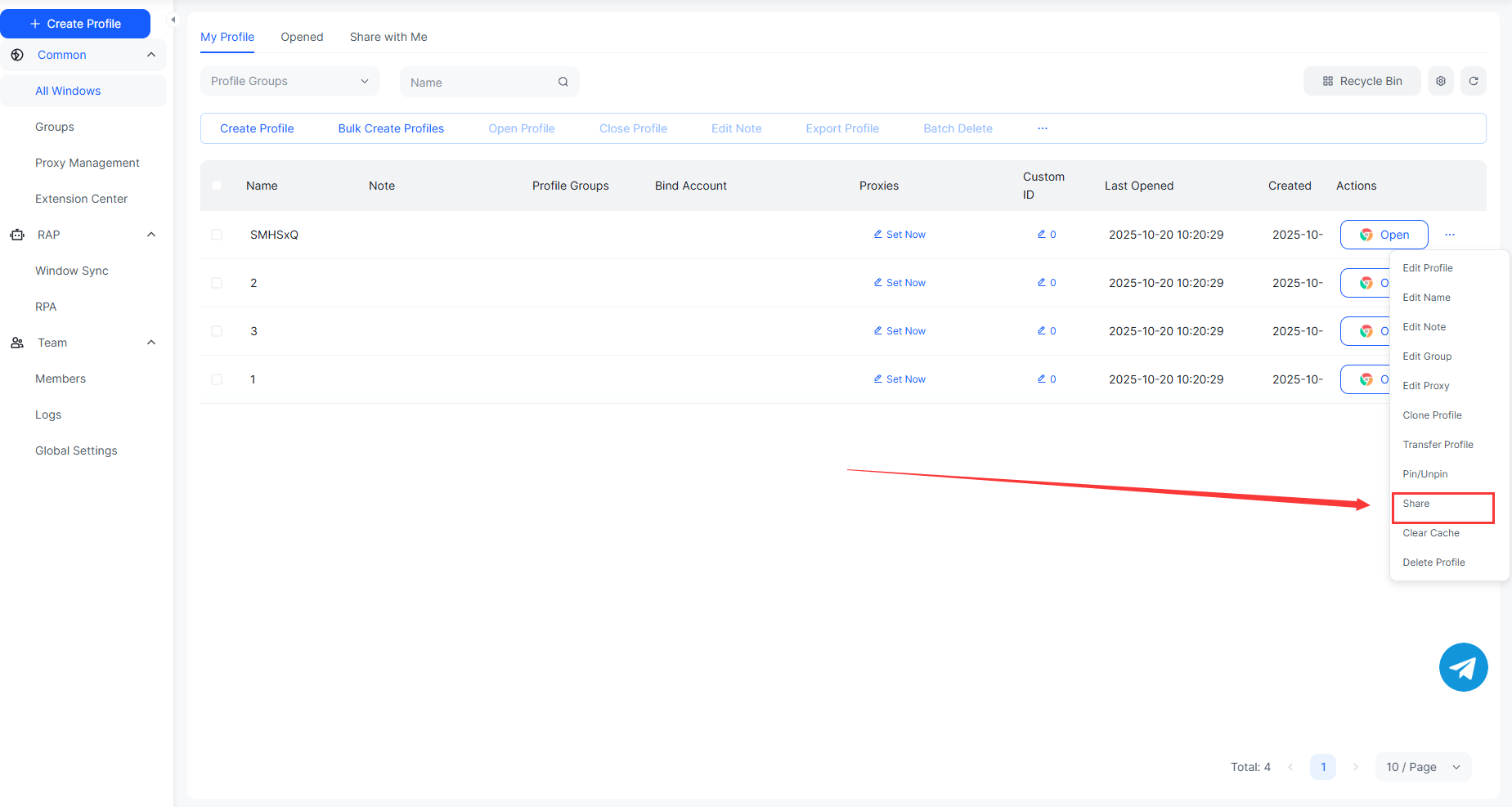 用户可以将特定浏览器环境(包括账号、Cookies、配置指纹)安全地共享给团队成员或客户,无需导出文件或暴露敏感信息。