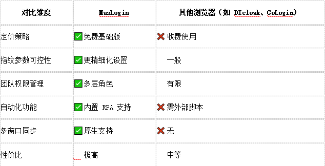 與其他反檢測瀏覽器(如 Multilogin、GoLogin、AdsPower)相比,MasLogin 最大的優勢是提供「永久免费版本」,同時也有更實惠的付費方案,滿足個人用戶與專業團隊的需求。