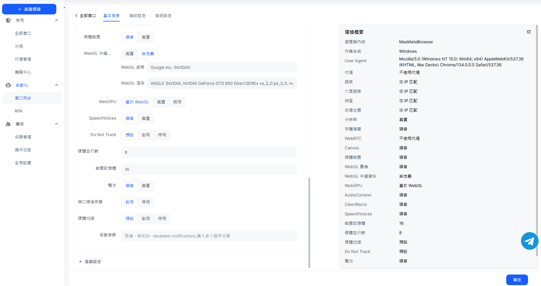 MasLogin 提供行業領先的指紋模擬技術,可對各種指紋參數(如 Canvas、WebGL、Font、Timezone、User Agent 等)進行細緻調整。