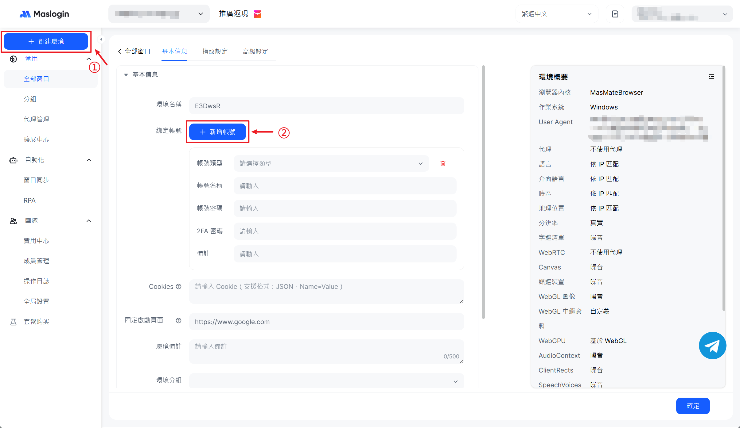 2. 在左上角點選【創建環境】建立獨立瀏覽器環境,於【基本信息】中點選【新增帳號】,選擇 LinkedIn 並填寫帳號資訊。