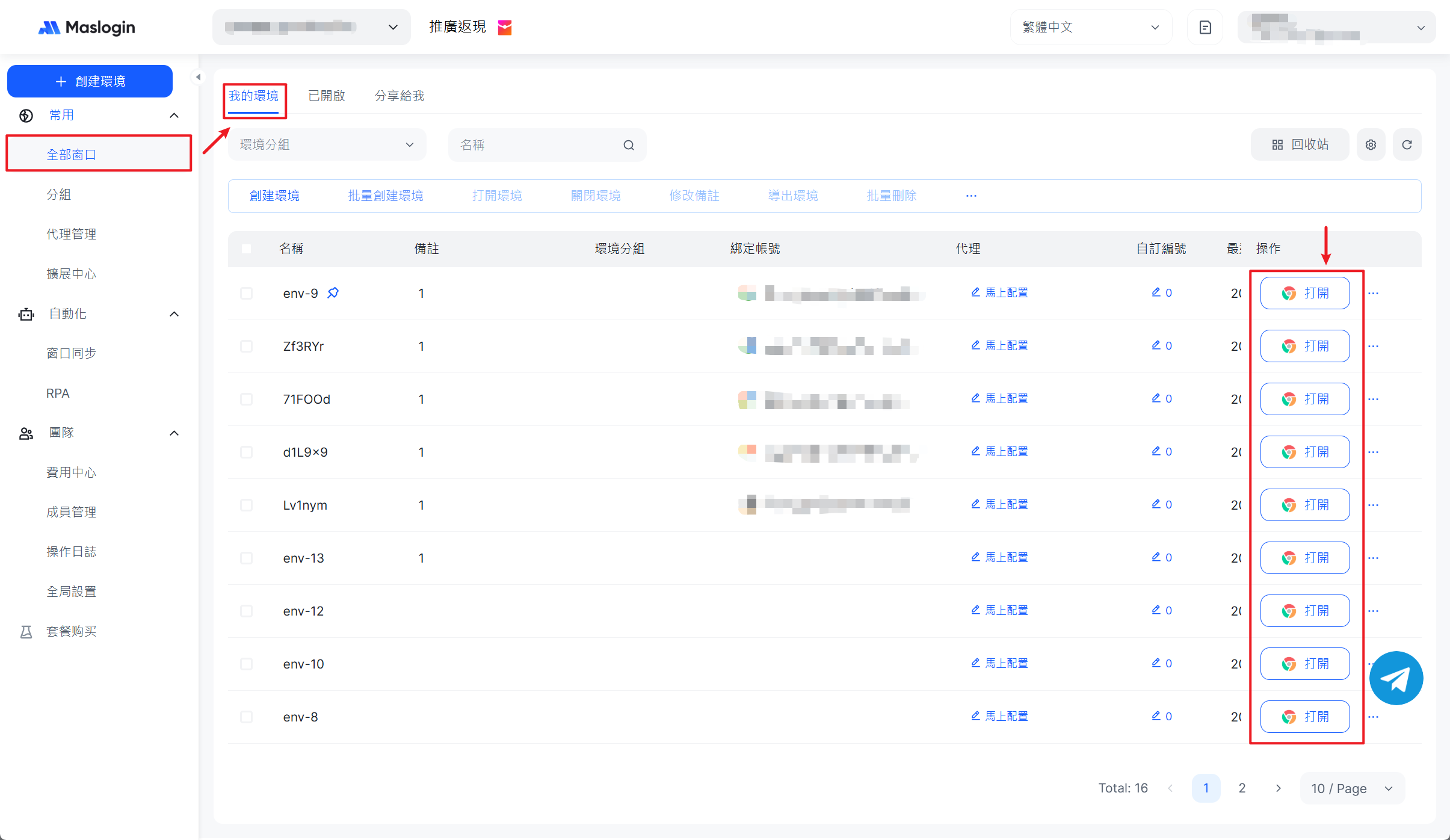 3. 新增完成後,進入 全部窗口 › 我的環境 找到包含該帳號的環境,點選【打開】啟動。