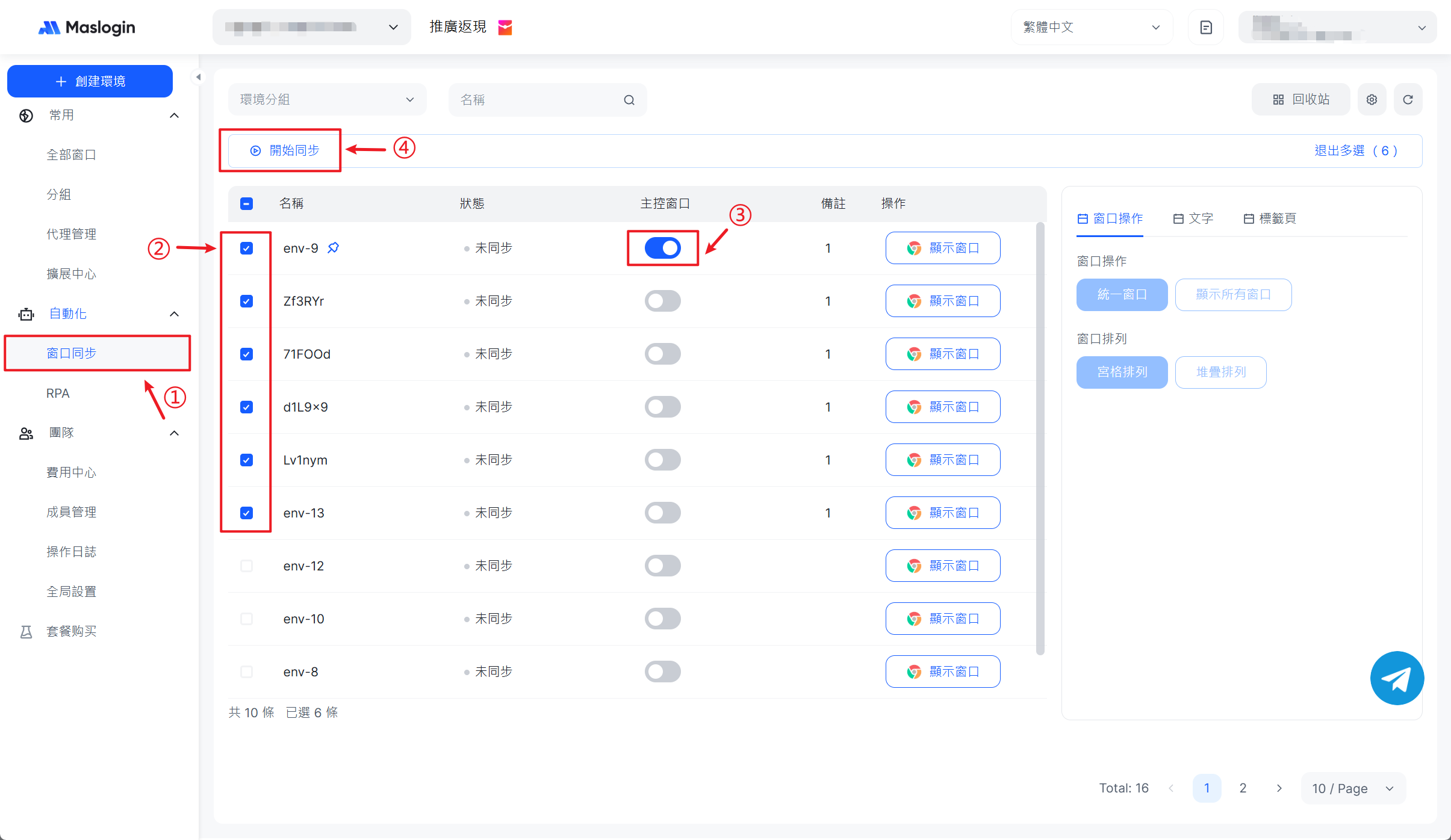 4. 需要同時管理多個帳號時,開啟【窗口同步】,勾選要啟用的環境,選擇其中一個作為【主控窗口】,點選【開始同步】,即可安全地並行操作多個 LinkedIn 帳號。